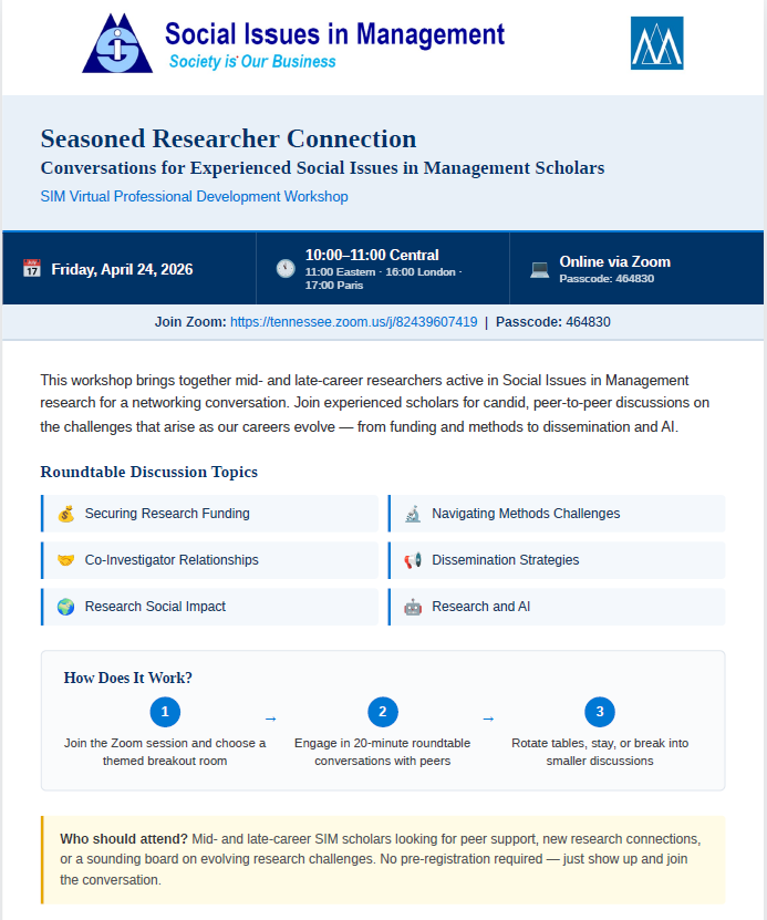 Seasoned Researcher Connection: Conversations for Experienced Social Issues in Management Scholars